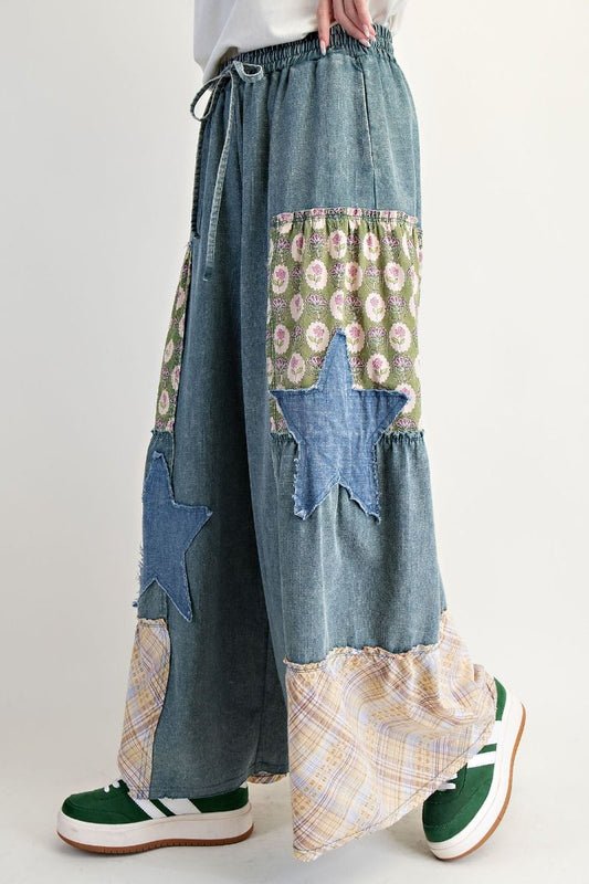 EASEL Patchwork Palazzo Pants Washed Denim