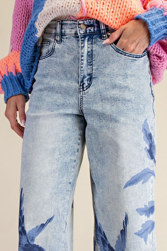 EASEL Bird Floral Print Stretch Washed Denim Pants