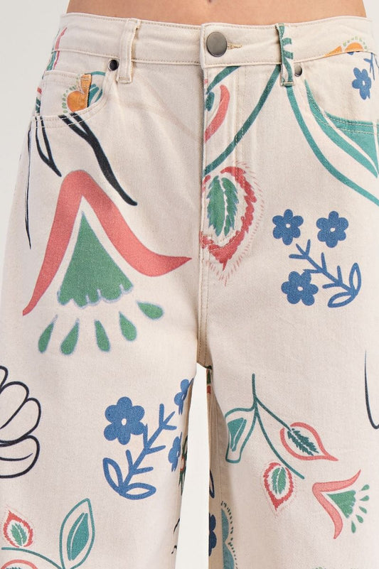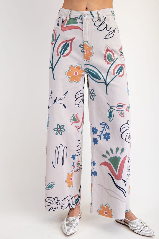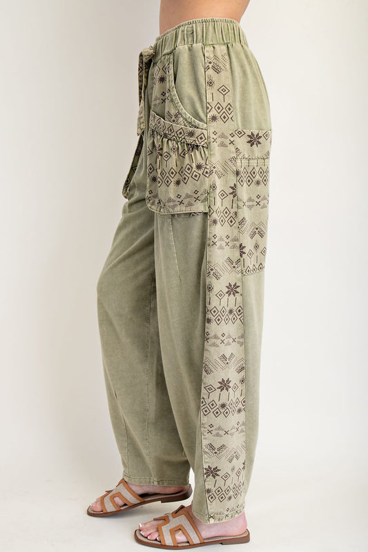 EASEL Ethnic Print Mix Mineral Washed Twill Barrel Pants Faded Olive