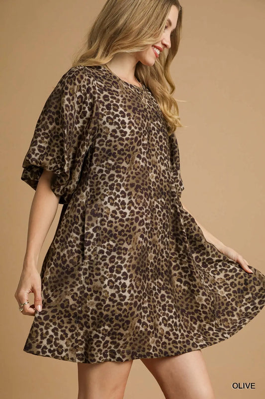 UMGEE Abstract Print Puff Sleeve Babydoll Dress Pink