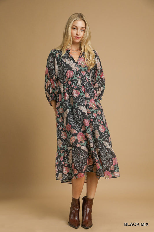 UMGEE Mix Boho Patchwork Print Tiered Midi Dress