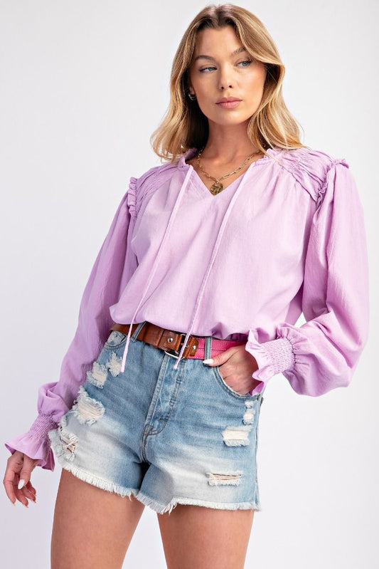 EASEL Cotton Woven Long Sleeve Blouse with Ruffle Hem Lilac Pink