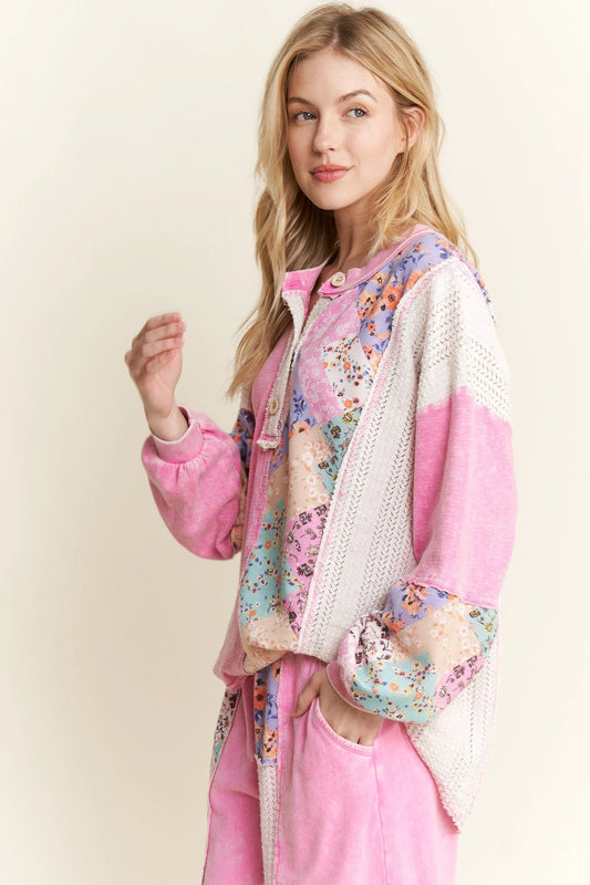 J. HER Mineral Washed Floral WaveKnit Jacquard Henley Boho Top Long Sleeve Bubble Gum