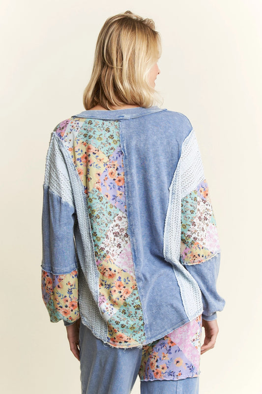 J. HER Mineral Washed Floral WaveKnit Jacquard Henley Boho Top Long Sleeve Denim Blue