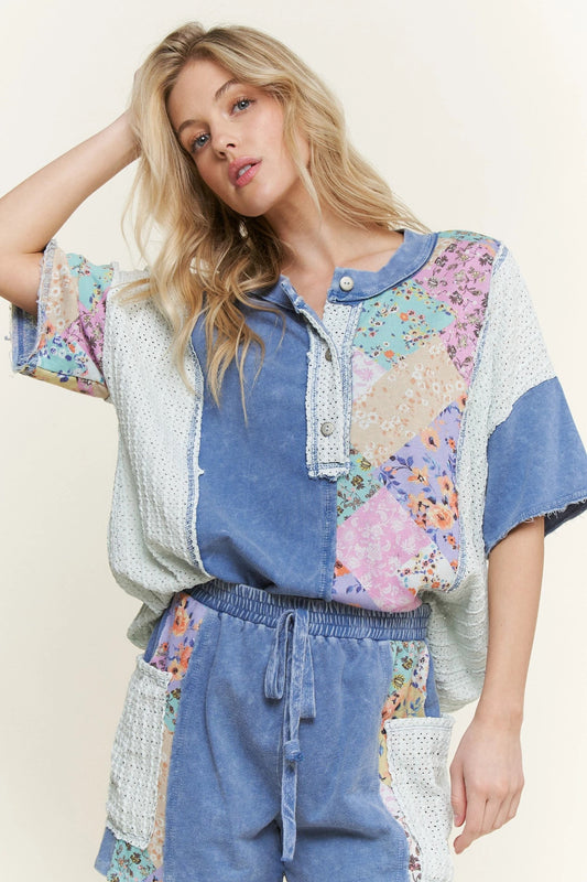 J. HER Mineral Washed Floral Printed Block Henley Top Short Sleeve Denim Blue