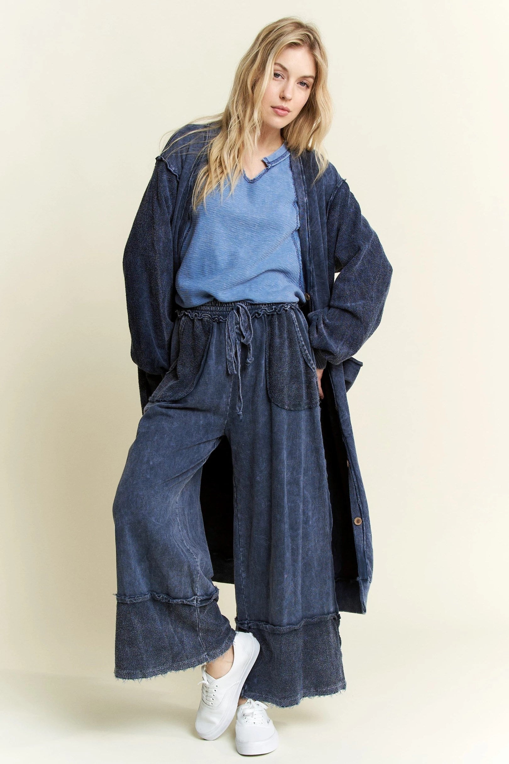 J. HER Mineral Wash Soft French Terry Oversized Cardigan Navy