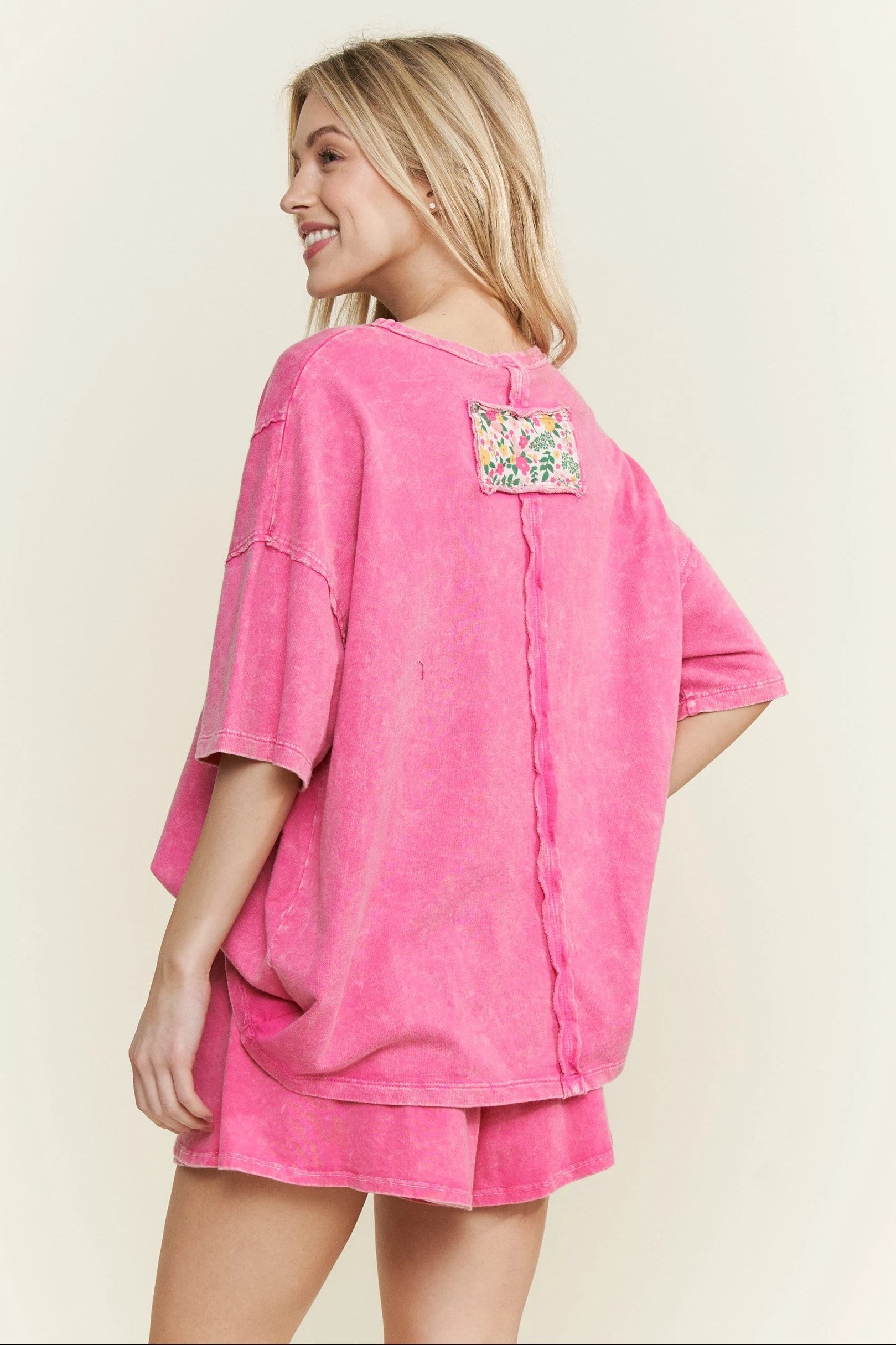 J. HER Mineral Washed Floral Flower Patched T-Shirt Hot Pink