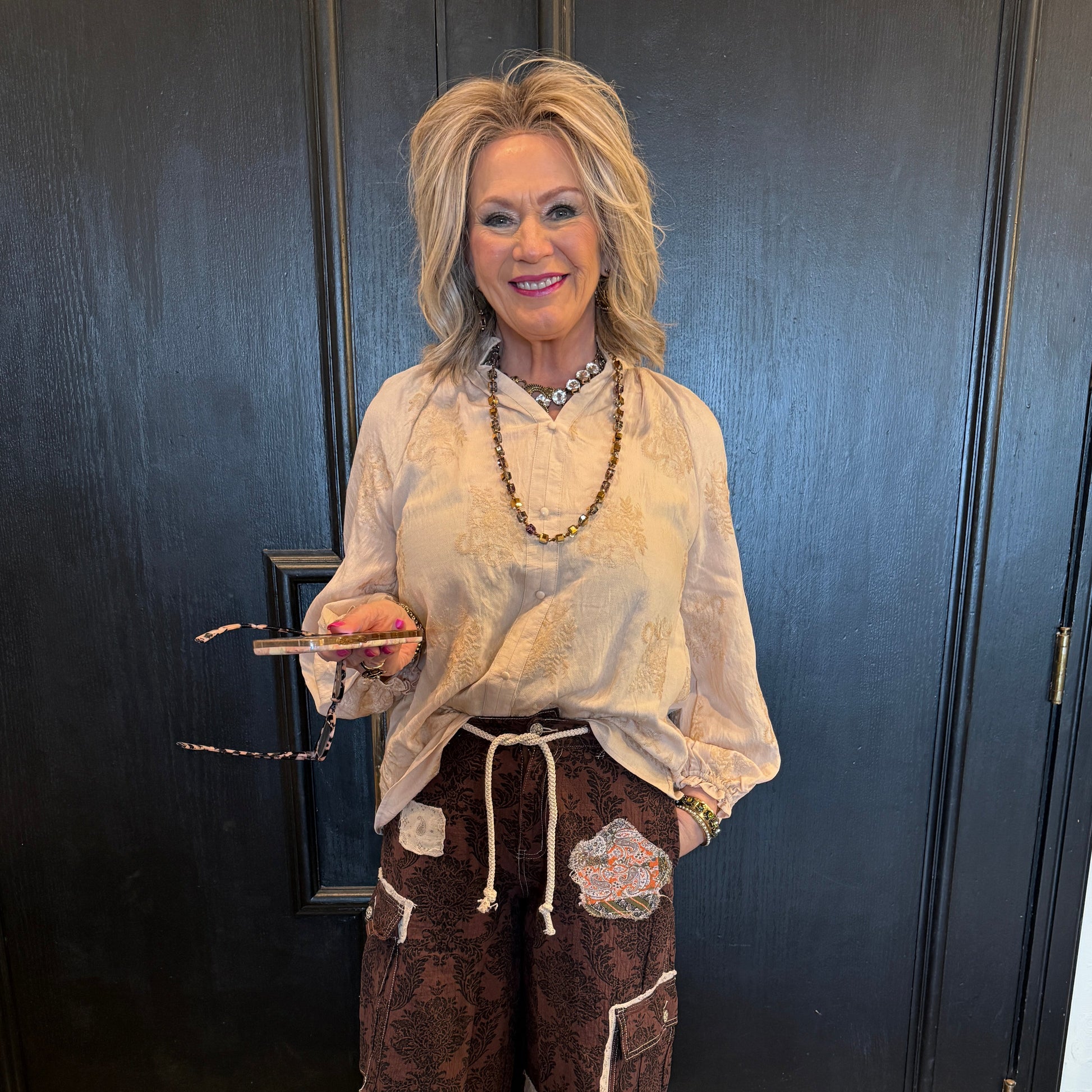 UMGEE Embroidered Boho Blouse with Balloon Sleeves Natural